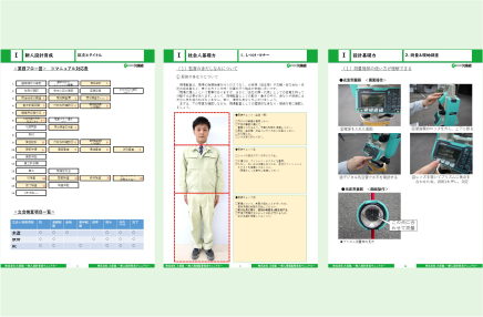 このマニュアルは、ベテラン社員と若手社員が意見を出し合いながら作りました。社会人の基礎知識はもちろん、現場監督の基礎知識や設計業務全体のフロー、使用機器の基本的な使用方法や書類の作成方法など写真を使いわかりやすく説明しています。